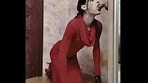 Travesti con vestido elegante chupa un consolador grande 2 min