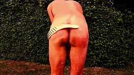 Esclavo blanco, patético y estúpido, desnudo, durante una fiesta al aire libre, entretiene a los invitados, se castiga a sí mismo a la orden, glande, testículos y culo gay, CMNM 6 min